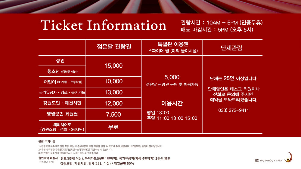 경로우대(만65세 이상), 국가유공자, 장애복지카드(보호자1인포함), 국가유공자카드(가족전체),영월군민, 단체 30명이상